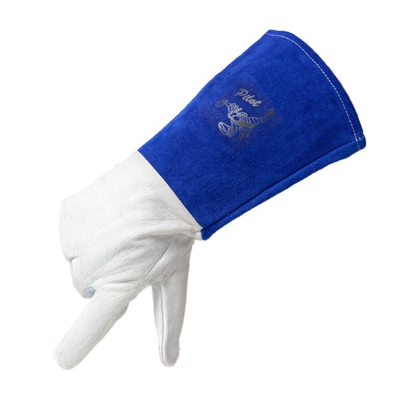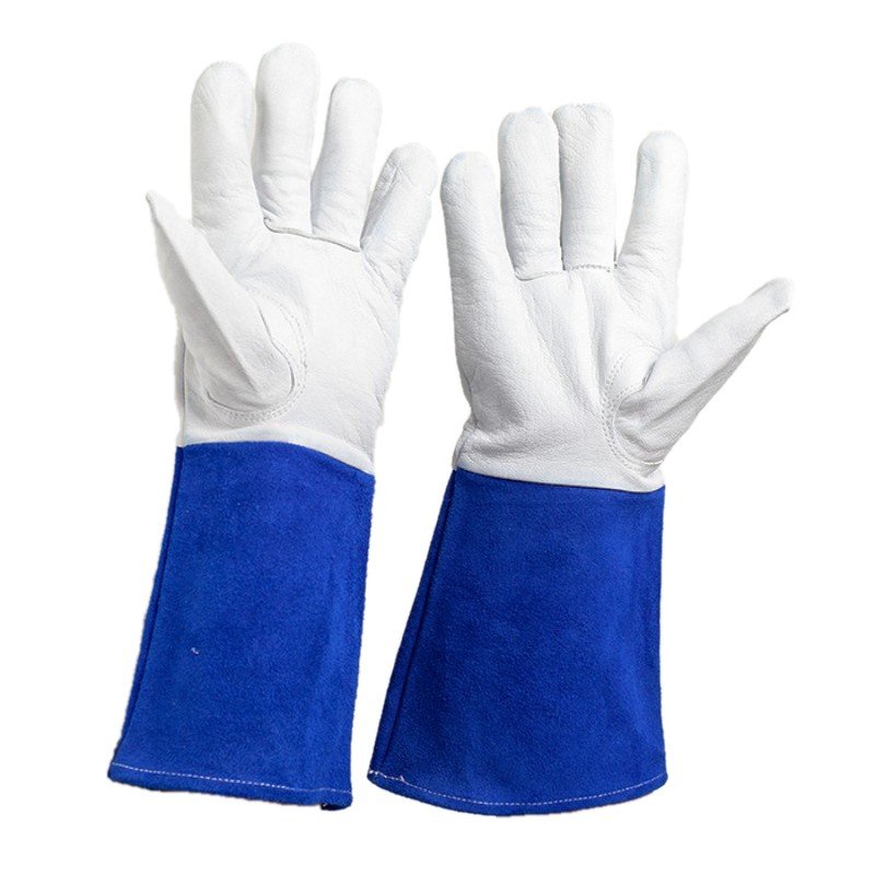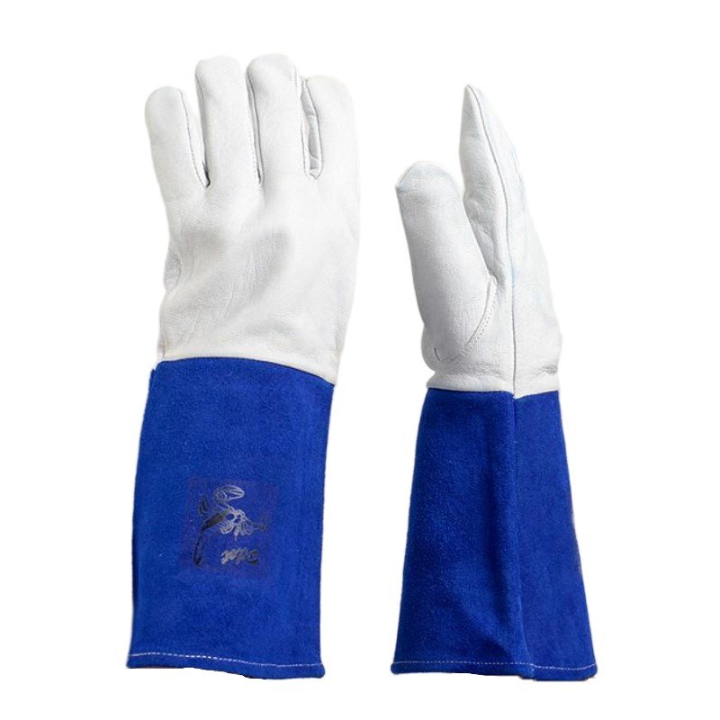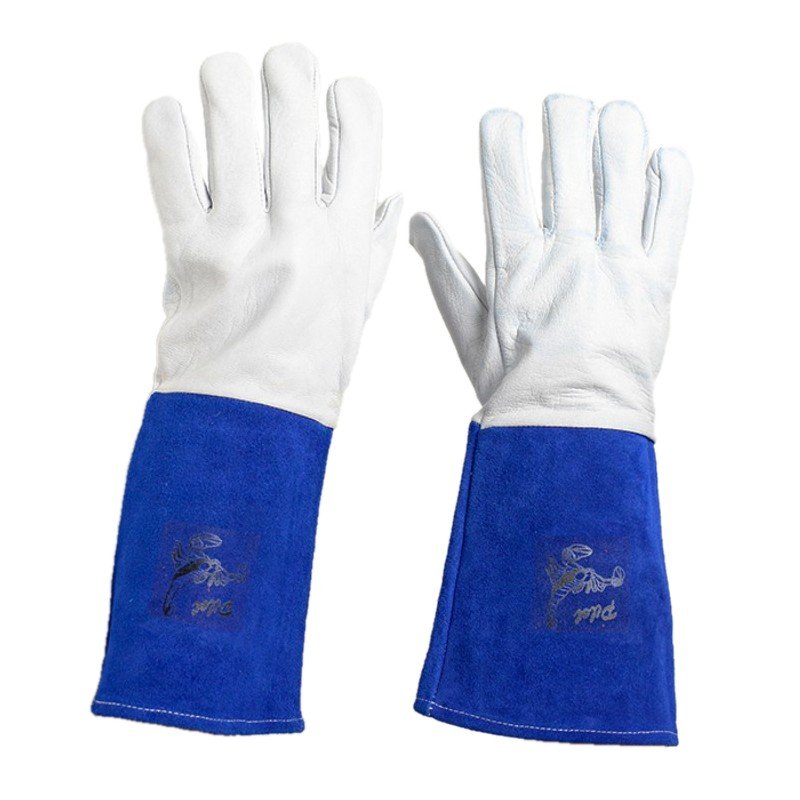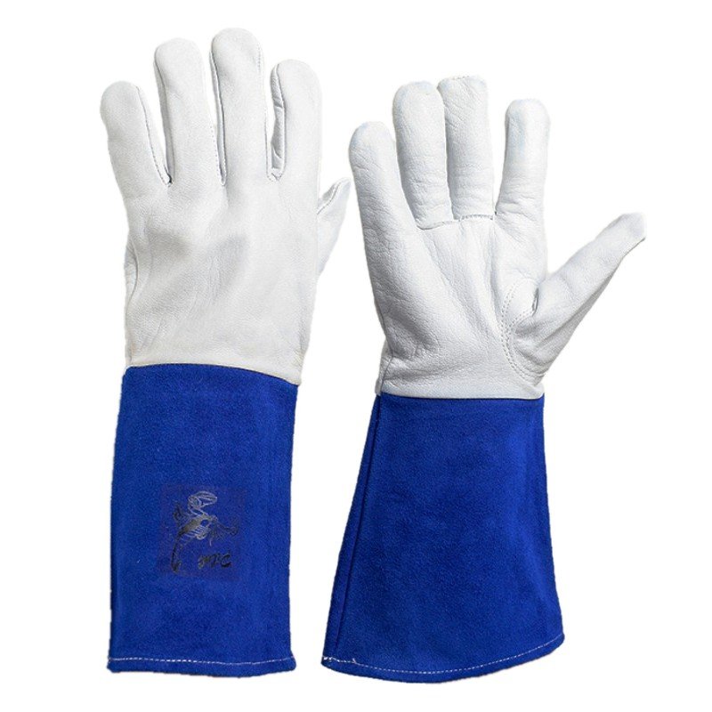 Designed as welding gloves, featuring a soft goatskin leather palm for dexterity and cow split leather cuff for enhanced durability against high-temperature splatters.