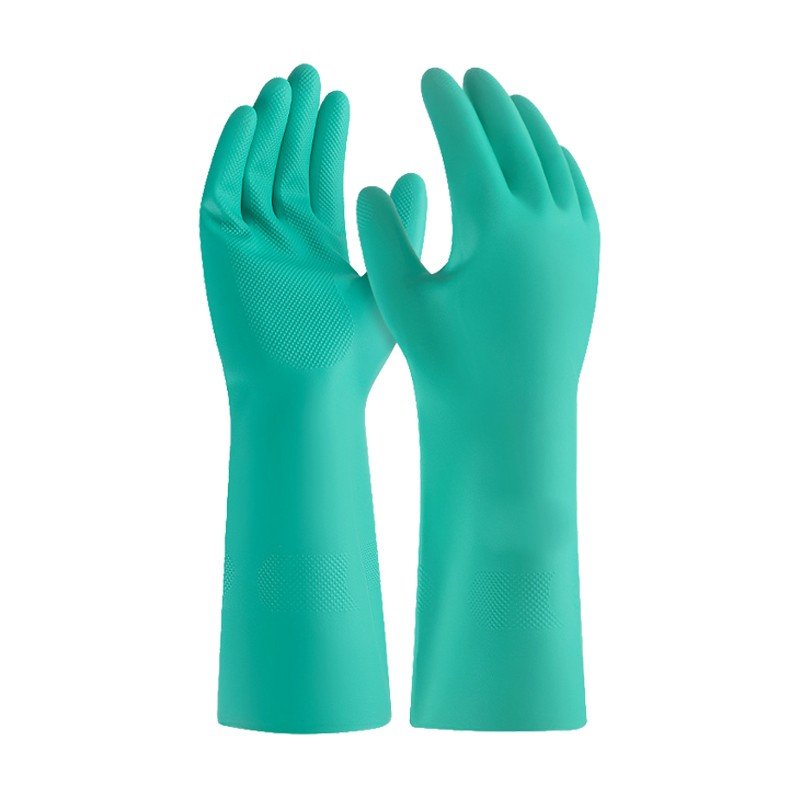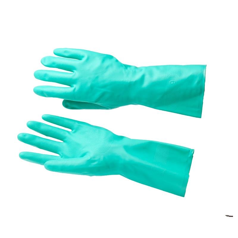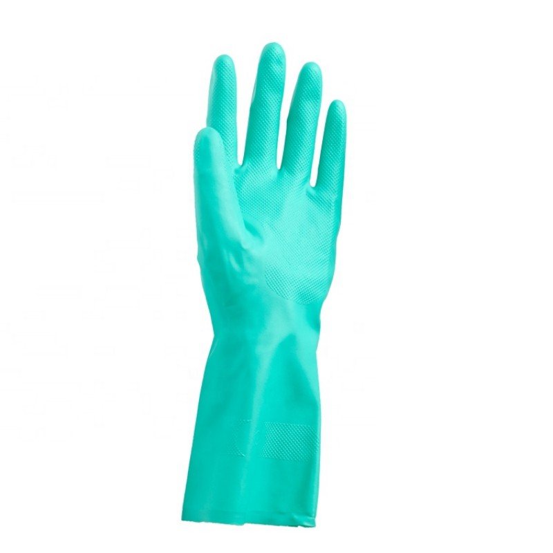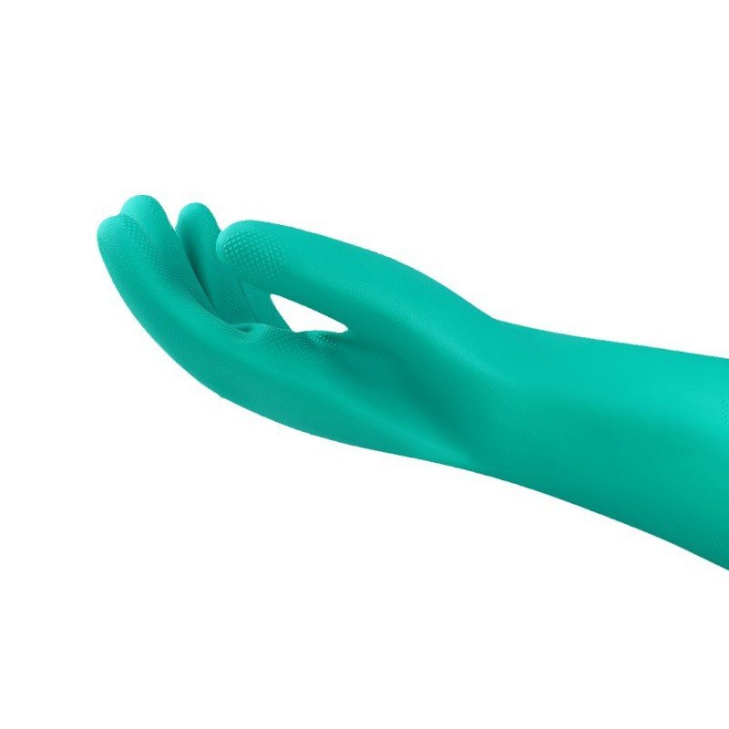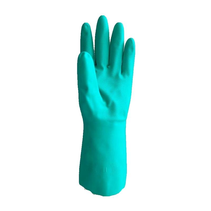 Green nitrile material provides reliable protection against oils, acids, and various industrial chemicals.